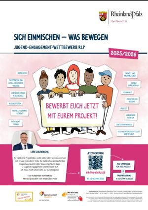 Ihr habt eine Projektidee, wollt selbst aktiv werden und vor Ort etwas verändern? Oder Ihr habt schon ein laufendes Projekt und sucht Hilfe? Dann macht mit beim 12. Jugend-Engagement-Wettbewerb RLP.