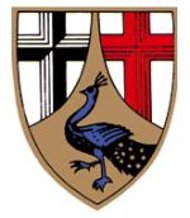 In Silber eine eingeschweifte goldene Spitze, darin ein rechtshin schreitender blauer Pfau mit gesenktem Schweif; oben vorn ein durchgehendes schwarzes, hinten ein durchgehendes rotes Kreuz.