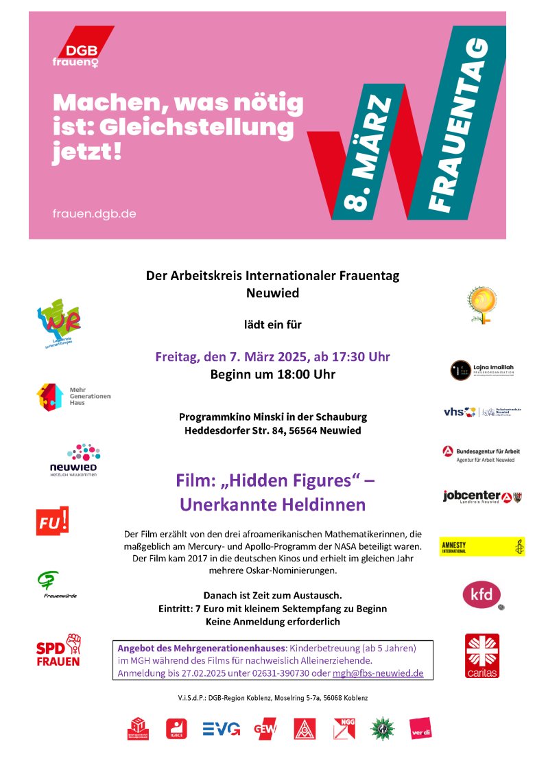 Der Arbeitskreis möchte mit dem Film die Beteiligung von Mathematikerinnen bei den NASA -Programmen ins Bewusstsein bringen. Oft ist der erhebliche Beitrag von Frauen an wissenschaftlichen Errungenschaften nicht bekannt. Der Film zeigt ein Beispiel dafür auf.“, sagt Daniela Kiefer, Gleichstellungsbeauftragte des Landkreises Neuwied. „Wir laden alle Frauen herzlich ein, den Film mit uns anzuschauen und in den Austausch darüber zu kommen.“